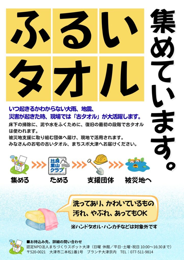 今回、まちづくりスポット大津では、災害支援の活動の一環として、一般社団法人比良里山クラブ様との連携のもと、古タオル回収を始めます!