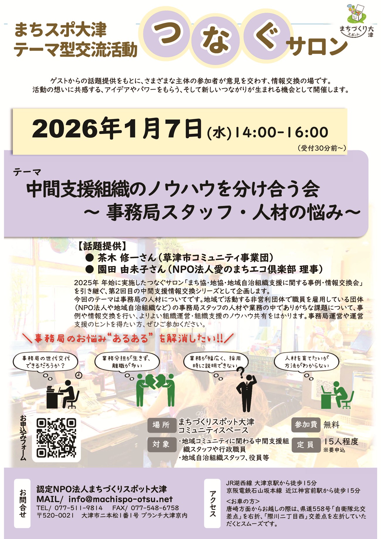 【開催1/7】つなぐサロン「中間支援組織のノウハウを分け合う会~事務局スタッフ・人材の悩み~」